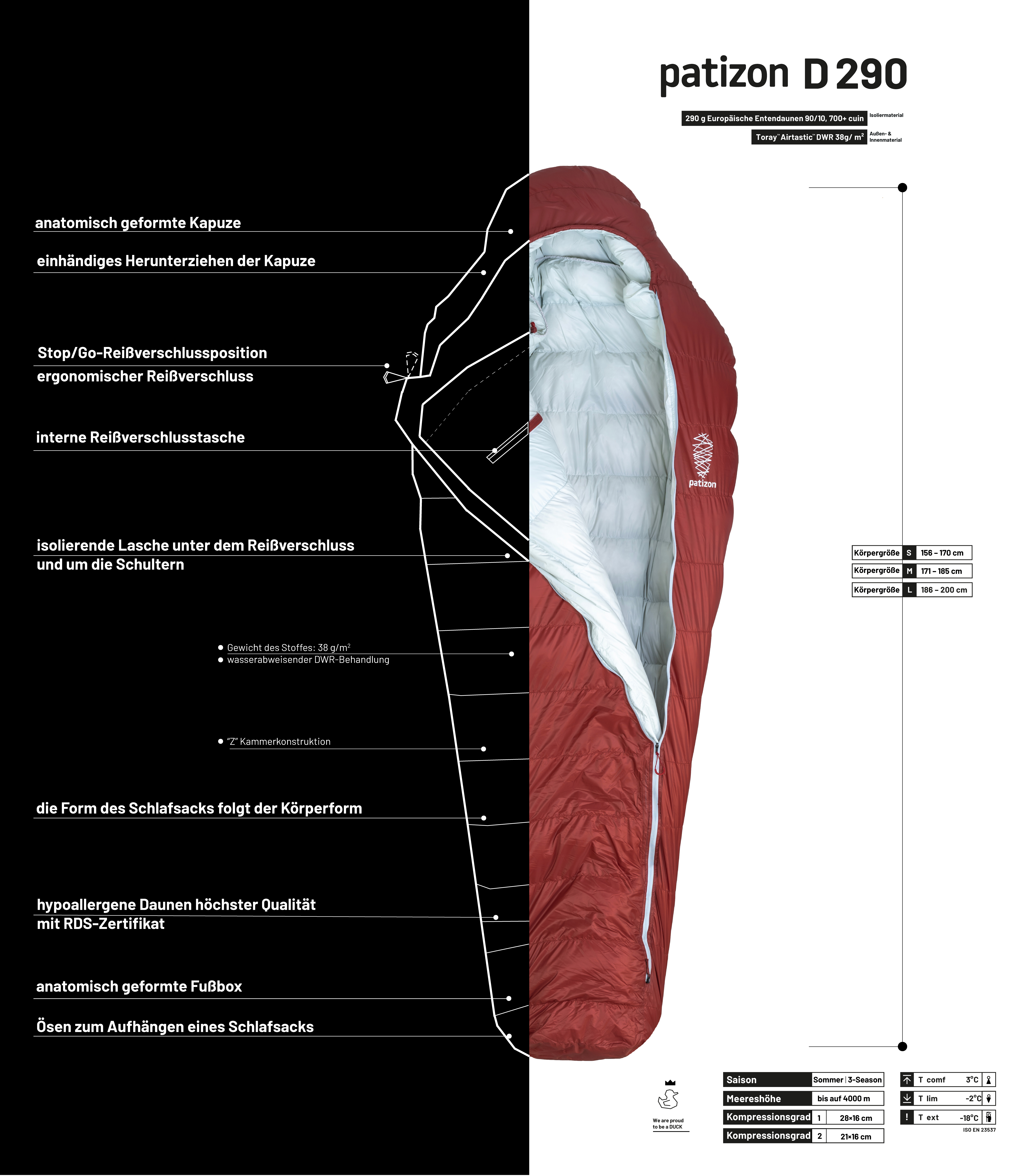 - Die D-Schlafsackreihe wird mit hochwertiger hypoallergener Gänsedaune mit RDS-Zertifikat und einer Bauschkraft von mindestens 700+ cuin gefüllt.