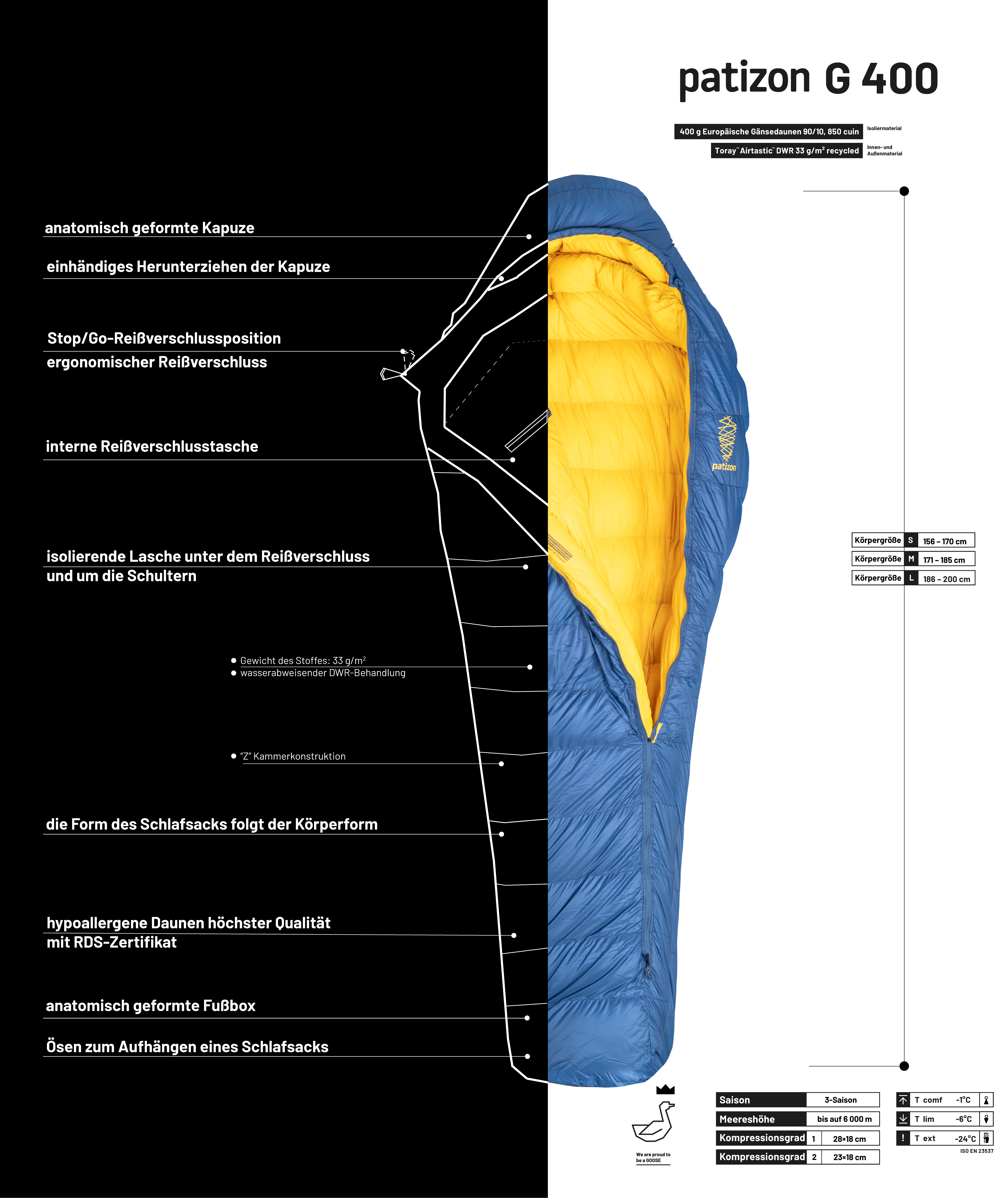 Unser leichtestes Modell aus der G-Serie hat einen großen Schritt nach vorne gemacht. Mit einem neuen Schnitt, dem Material Toray™ Airtastic™ und Gänsedaunen mit einer Bauschkraft von 850 cuin bietet es fantastische Eigenschaften. Trotz seines Gewichts und seinem kleinen Packmaß, bietet es unglaubliche Isolationseigenschaften. Es ist daher die ideale Wahl für alle, die kein einziges zusätzliches Gramm tragen wollen, aber dennoch einen Schlafsack haben möchten, der ihnen einen ruhigen Schlaf vom Frühling bis zum Herbst, und sogar bei Temperaturen unter null Grad Celsius, ermöglicht. Ob anspruchsvolles Trekking, Klettern an hohen Wänden oder Fahrradexpeditionen - der Patizon G 400 ist genau das Richtige für Sie.