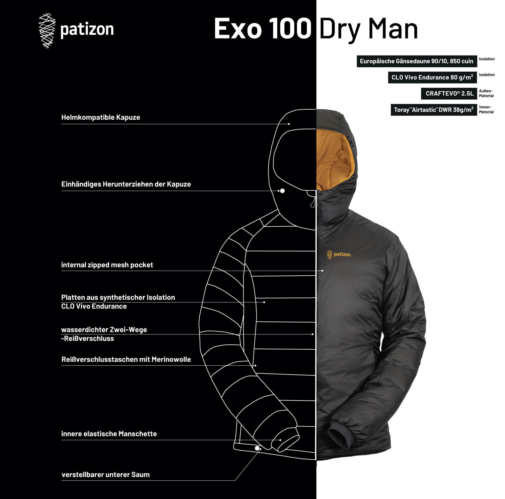 Die Patizon Exo 100 Dry setzt auf eine Hybridkonstruktion, bei der jede Art der Isolierung dort eingesetzt wird, wo sie ihre Stärken optimal ausspielen kann: