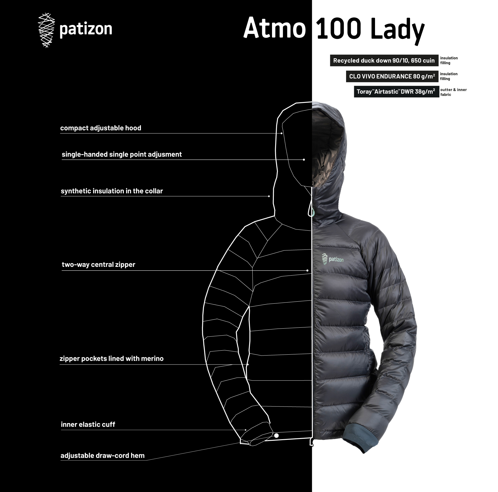 - Patizon Atmo 100 is entirely sewn from premium Toray™ Airtastic™ material with a DWR water repellent treatment, excellent breathability, and a very good balance between low weight and durability.