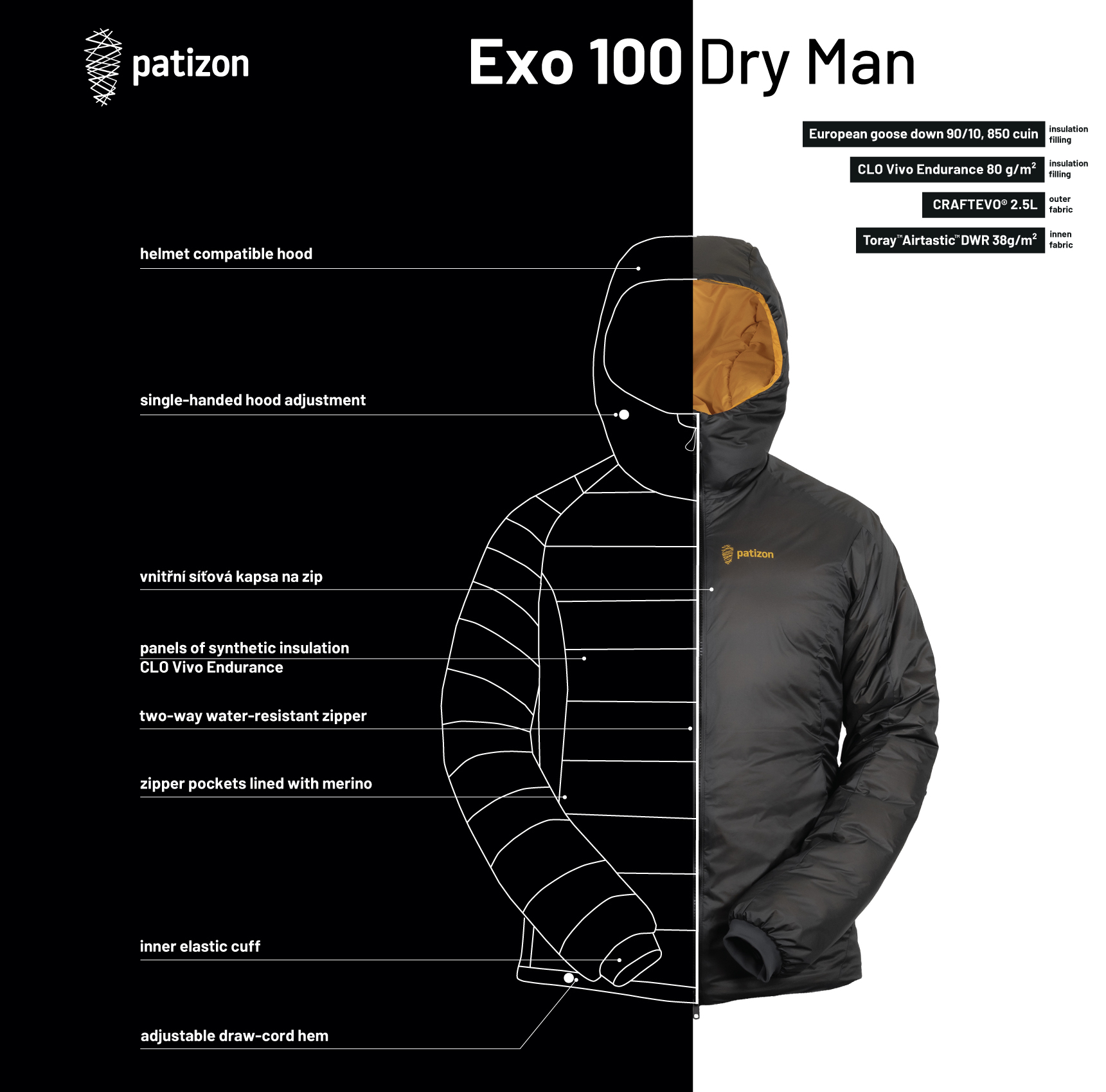 Patizon Exo 100 Dry uses a hybrid construction, placing different insulation types exactly where they perform best:
