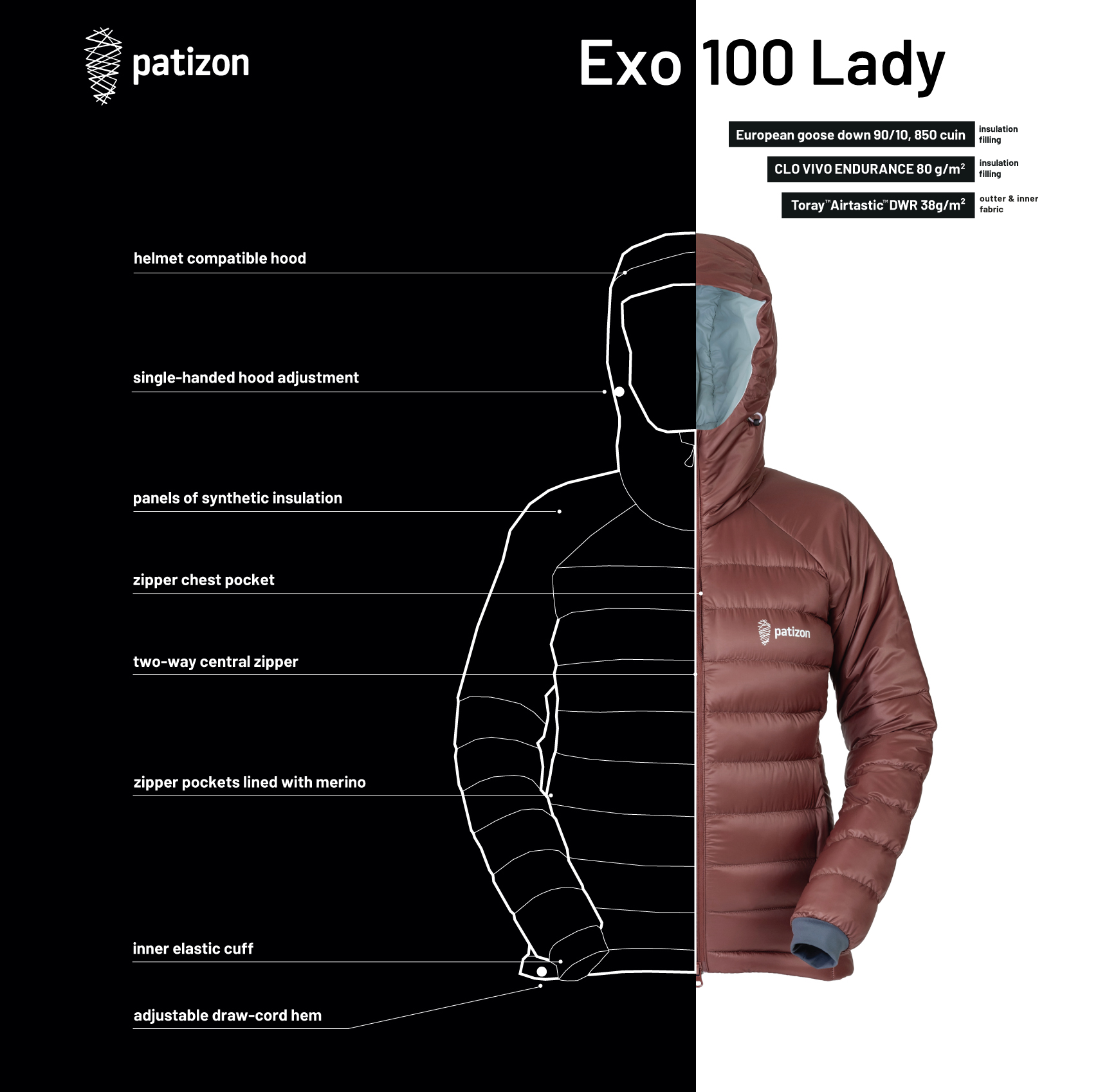 - Patizon Exo 100 uses hybrid construction. Different parts of the jacket use different insulation materials.