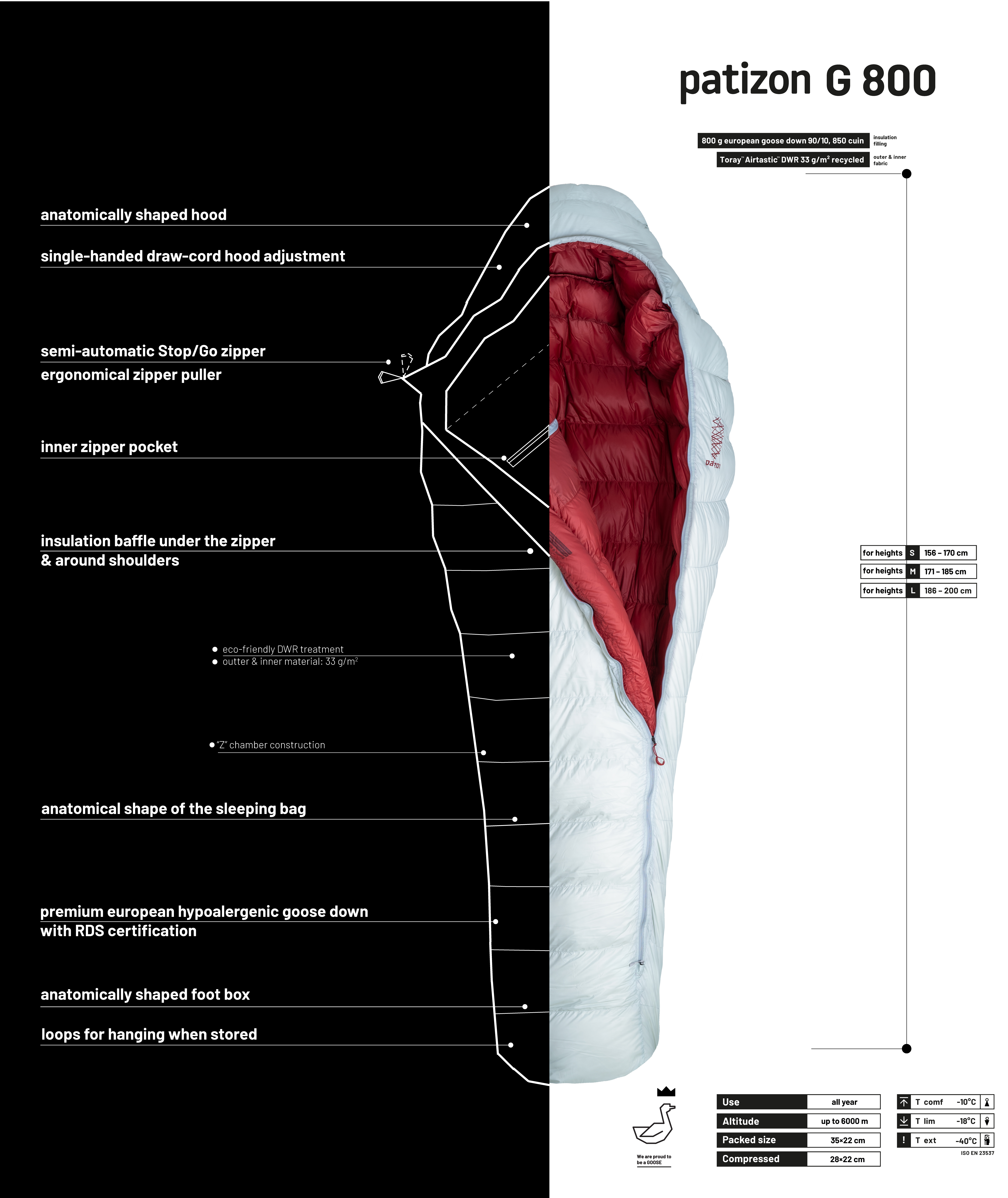 The One to rule them all. Extremely lightweight with great pack size/warmth ratio. The G 800 is suitable for all outdoor activities during the whole year. As the sleeping bag features premium 850 cuin goose down, new updated shape and superlight Toray™ Airtastic™, hardcore users may use it the same way as we do: as a superlight solution for all winter activities. Just imagine - 1.1 kg of weight and comfort rating at minus 10 degrees. Priceless. More