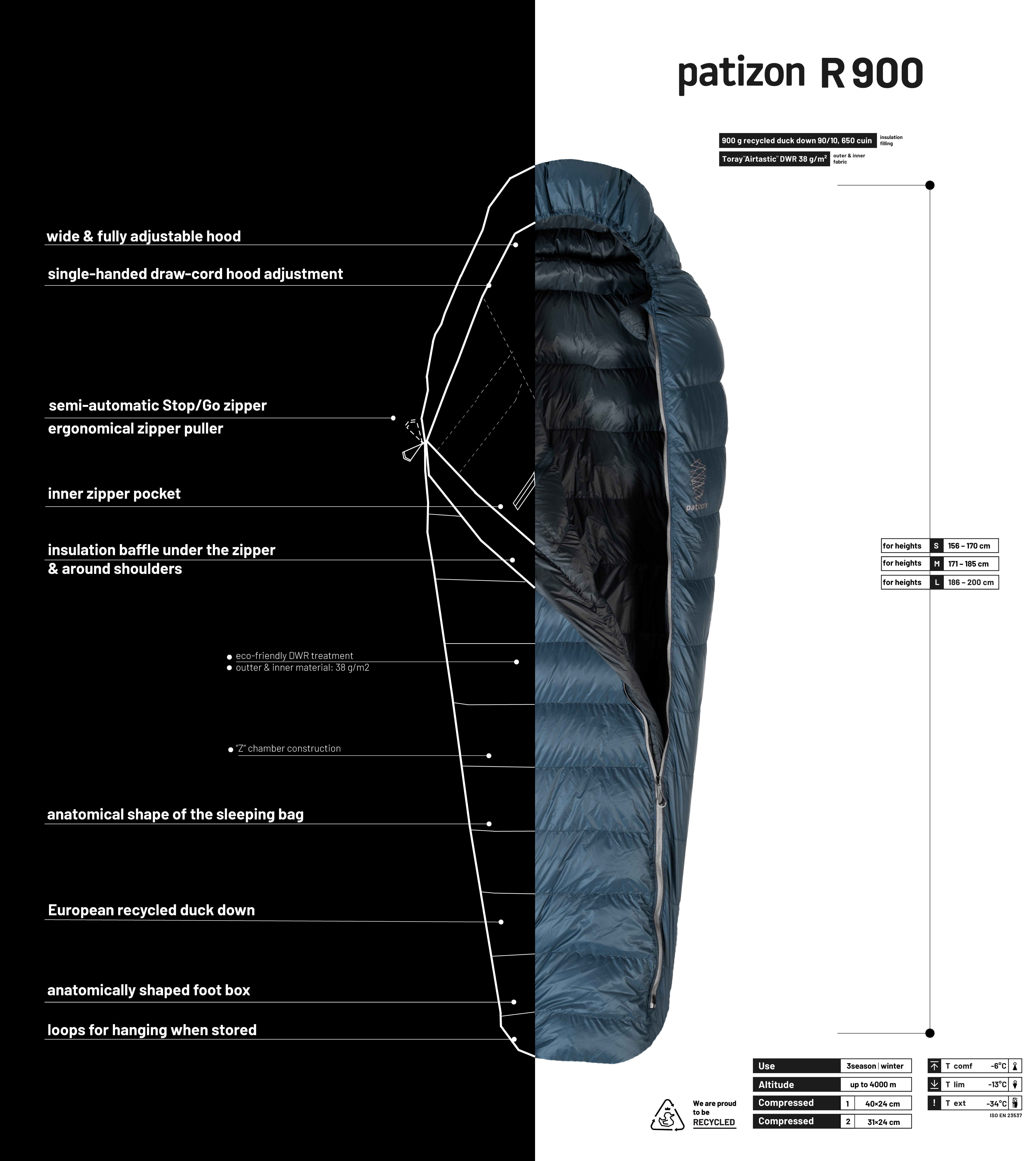 The warmest model in the R series features 900g of recycled duck down with a fill power of 650 cuin. This means it’s a sleeping bag that more resilient individuals can easily use year-round. Those more sensitive to the cold may consider it as a three-season option with significant insulation overlap. In this model as well, you’ll find high quality material, recycled down insulation and all the technical details that belong to a Patizon sleeping bag. More