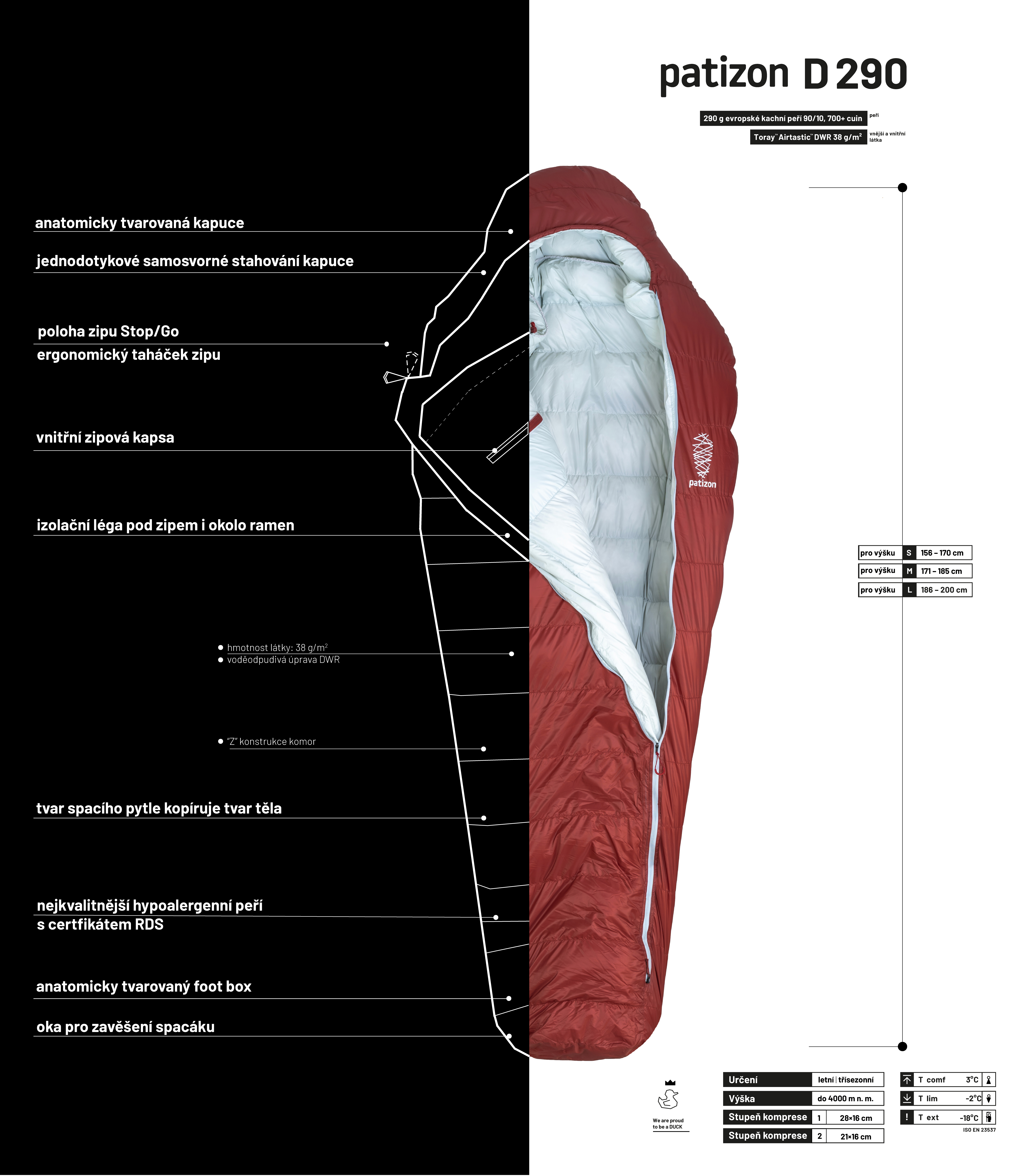 D 290 je náš ultralight se skvělým poměrem tepelného komofortu, hmotnosti a sbalitelnosti, se zachováním všech technických vychytávek. Má přesně tu velikost a váhu, která vám nepřekáží, ale zároveň vás dokáže zahřát při jakémkoliv letním dobrodružství. Ti zkušenější a více otužilí jej dokáží využít od května do září, a samozřejmě, v zimě je skvělý na horské chaty, winterraumy. Navíc jsme i na modelu D 290 implementovali rovný zip na přední straně spacáku, čímž jsme vylepšili nejen tepelně-izolační schopnosti spacáku, ale také manipulaci se zipem a objem po sbalení. Více