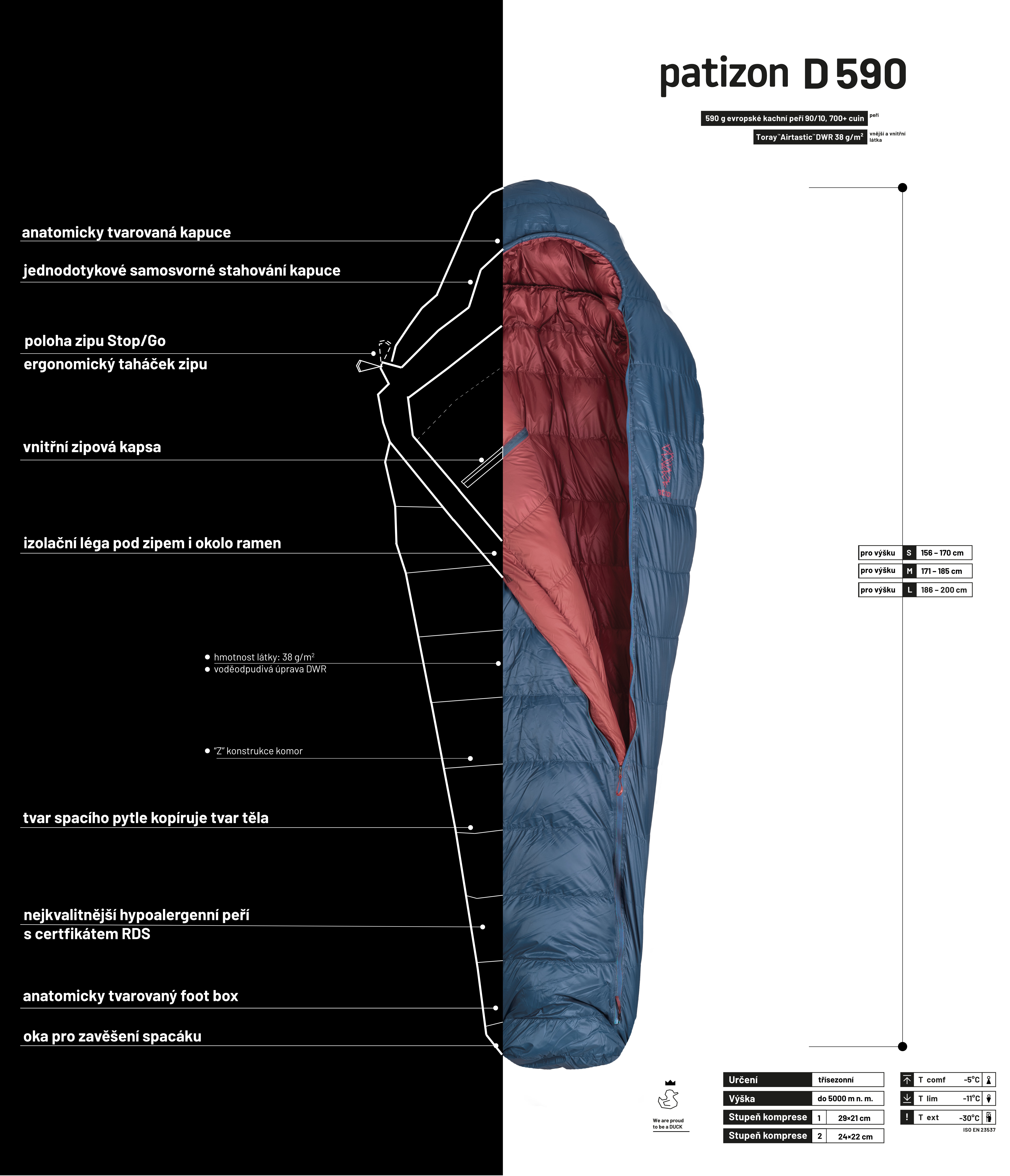 Odlehčený třísezonní spacák pod názvem D 590 je kousek, který by měl mít doma snad každý. Jak už je pro Patizon dobrým zvykem, žádné gramy navíc tahat nebudete, přitom si dopřejete kvalitního zpracování a top materiálů. Někteří odvážlivci tenhle kousek použij í celoročně. Na D 590 najdete rovný zip na přední straně spacáku, čímž jsme vylepšili nejen tepelně-izolační schopnosti spacáku, ale také manipulaci se zipem a objem po sbalení. Neříkáme ne, ale nejvíce mu sedí teploty kolem nuly. Více