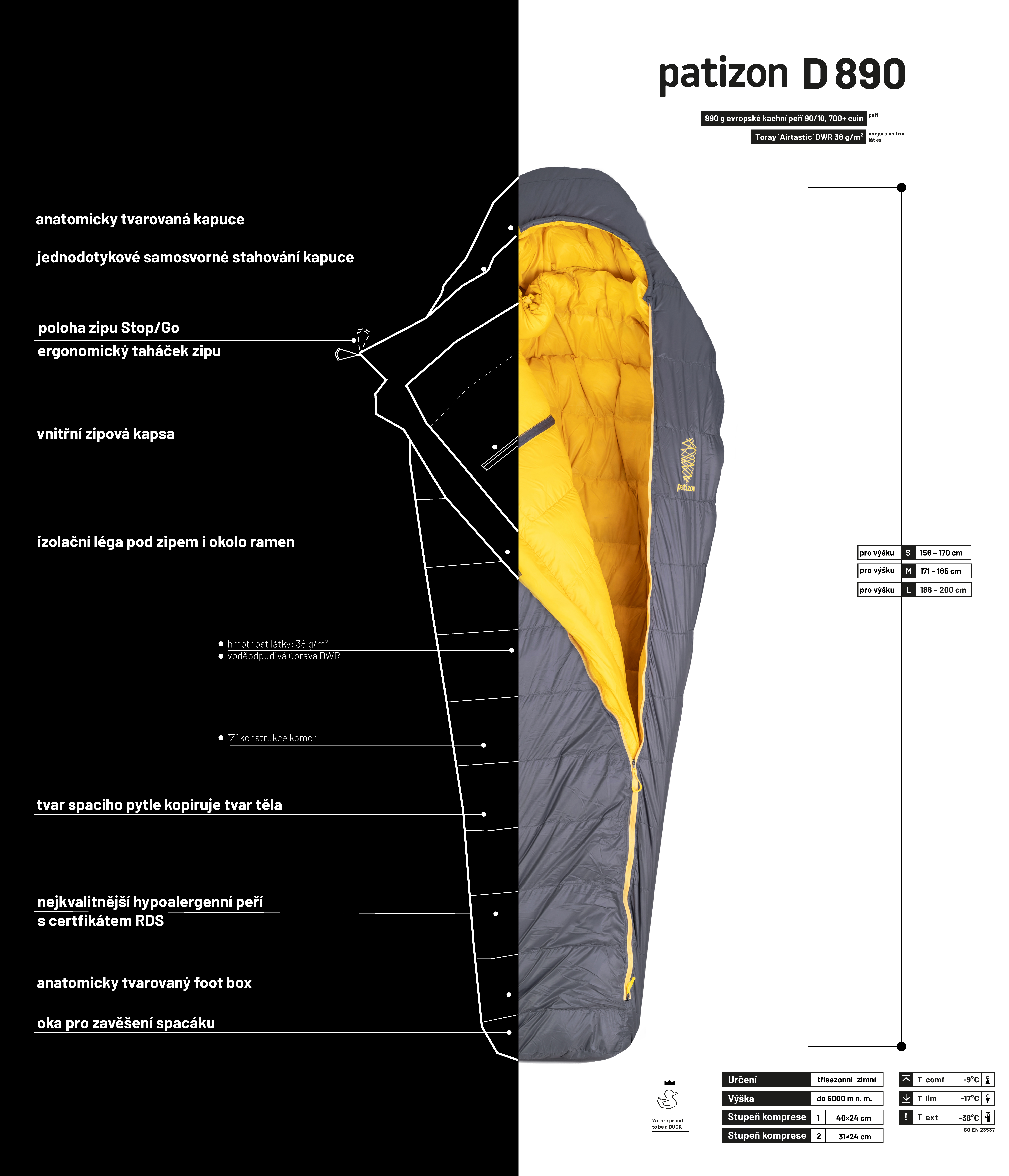 Spacáky Patizon mají anatomický střih. To znamená, že kopírují tvar postavy tak, aby byly co možná nejvíce efektivní v udržení tepla. Tvar jsme ale ladili ještě trochu víc - například tak, aby v ramenou byl spacák dostatečně široký na to, abyste si zavření ve spacáku dokázali sundat mokré ponožky a oblíknout si suché. Oblast nohou je pak samozřejmě řešena specifickým počtem a polohou komor tak, aby izolace na chlad náchylných nohou byla maximální.