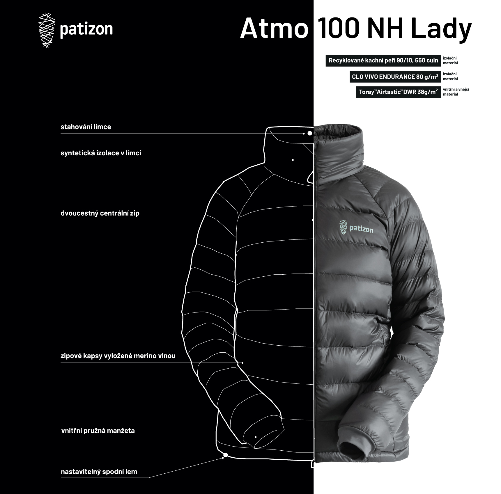 - Patizon Atmo 100 NH je kompletně ušitá ze špičkového materiálu Toray™ Airtastic™ s vodoodpudivou úpravou DWR, skvělou prodyšností a dobrým poměrem nízké váhy a odolnosti. Navíc s cesrtifikací BlueSign™.