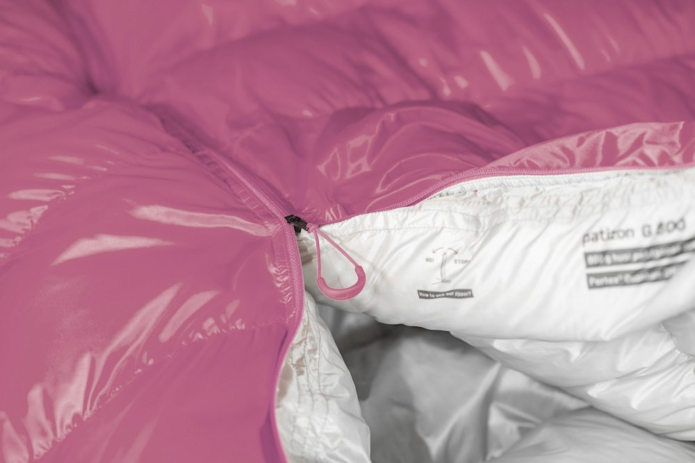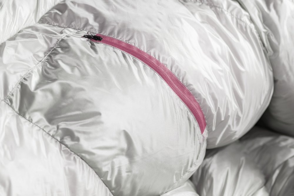 - Konstrukce s využitím rovného zipu pro jednodušší ovladatelnost, nižší hmotnost a ještě lepší tepelně-izolační vlastnosti spacáku. Pod celým zipem je izolační léga naplněná peřím, která efektivně eliminuje úniky tepla.